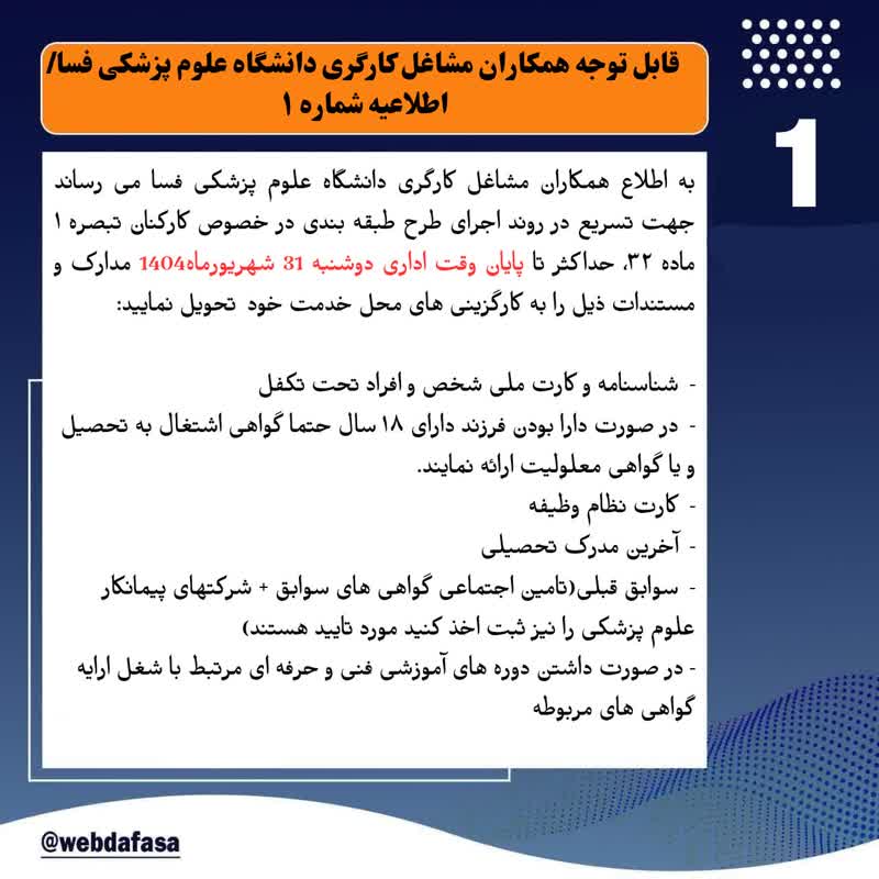قابل توجه همکاران مشاغل کارگری دانشگاه علوم پزشکی فسا/اطلاعیه شماره ۱