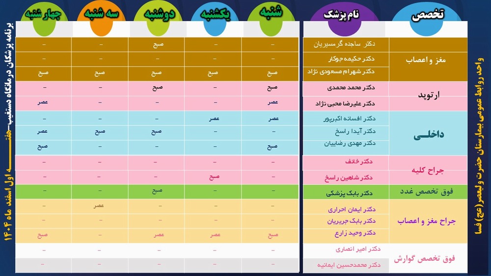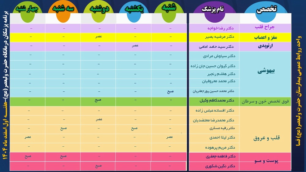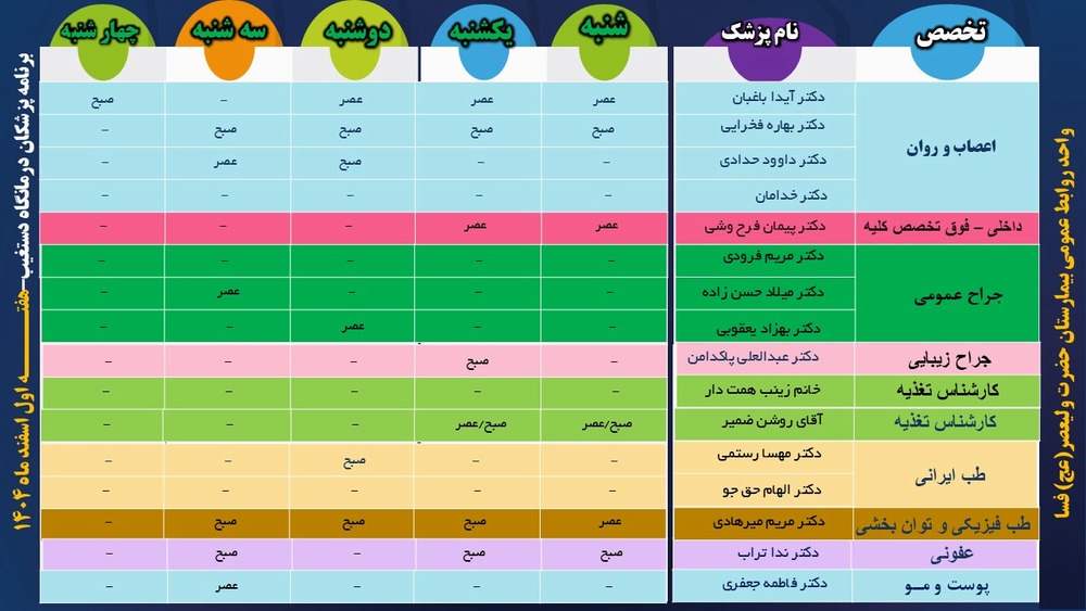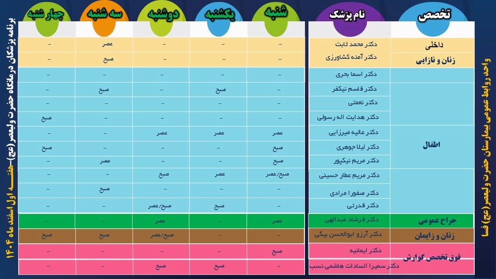 برنامه هفتگی پزشکان درمانگاه حضرت ولیعصر(عج) و کلینیک دستغیب